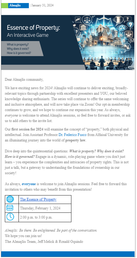 Join Assistant Professor Federico Fusco at Saudi Aramco's exclusive HR event for an illuminating journey into the world of property law. Dive deep into the quintessential questions: What is property? Why does it exist? How is it governed? Engage in a dynamic, role-playing game where you don't just learn – you experience the complexities and intricacies of property rights. This is not just a talk, but a gateway to understanding the foundations of ownership in our society.